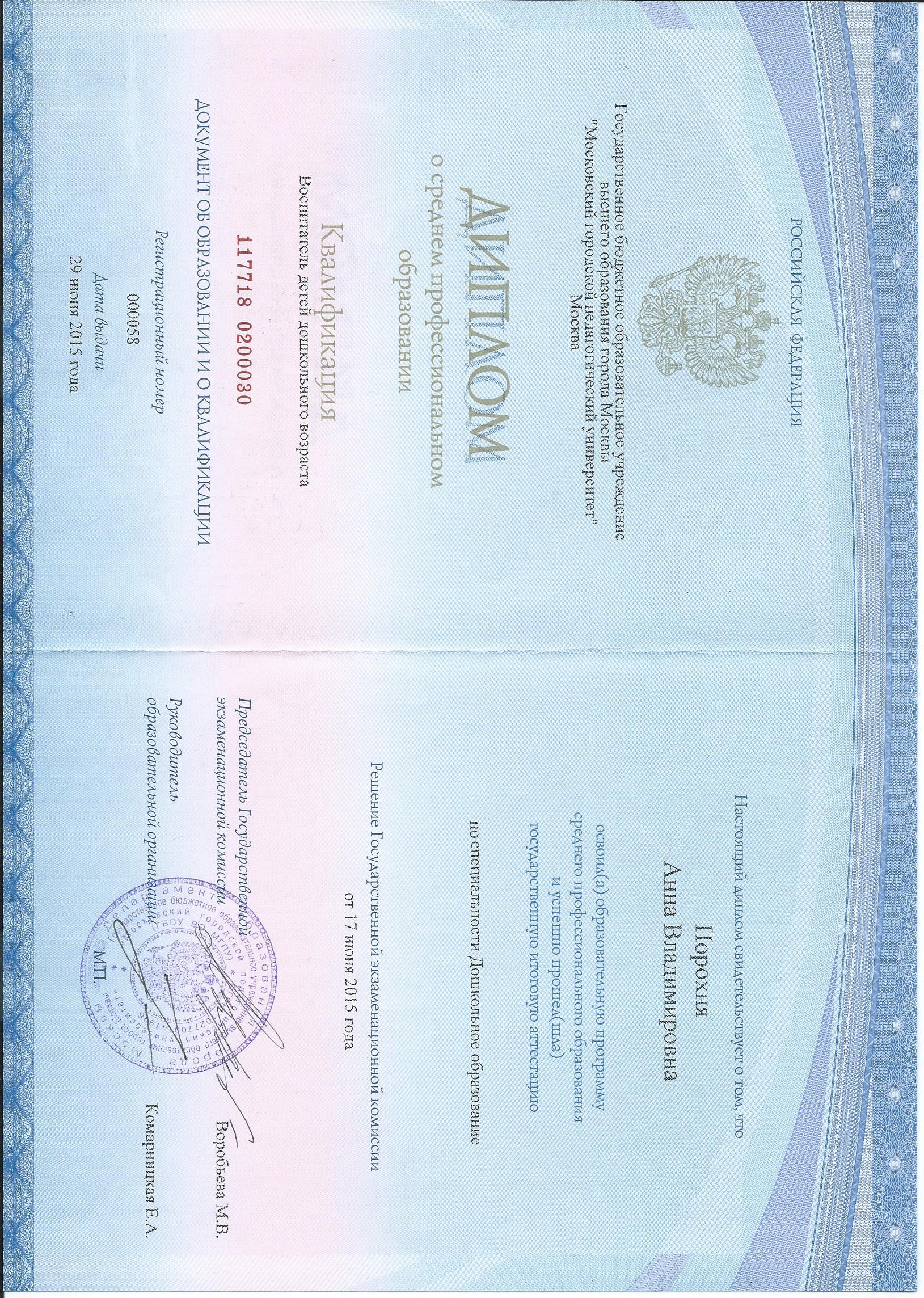 (выдан: Государственное бюджетное образовательное учреждение высшего образования города Москвы "Московский городской педагогический университет" Москва., 29/06/2015)